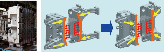 均匀受压模板方式降低变形弯曲,实现了高刚性。通过把锁模力均匀分布于模具面,大大减低铸造飞边,充分发挥低压铸造和锁模力低减效果。去除多余,采用加强筋设计。采用高度CAE解析,优秀的形状设计。