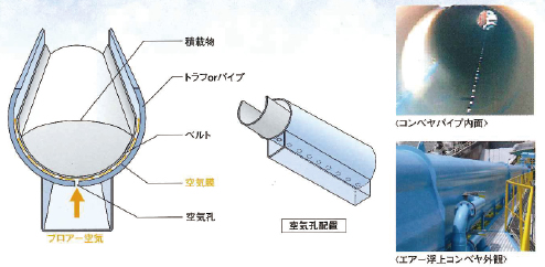 ローラーに代わり、空気膜でベルトを支持しています。従って従来のコンベヤに比べ摩擦係数が小さくなるので、モーター容量が低減でき、省エネが可能です。