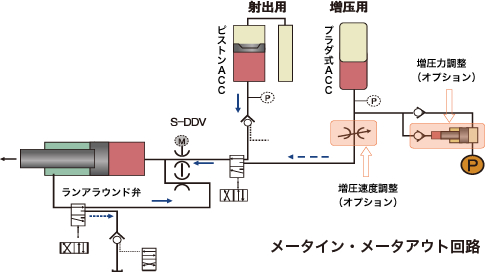 ?負荷に見合った圧力となるメータインと、速度安定に効果のあるメータアウトのそれぞれの利点を生かした「メータイン?メータアウト回路」による射出速度安定化。