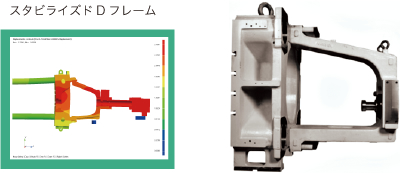 型締部および射出部をモデル化した大規模高度CAE解析(ADVC)を実施し、射出装置の挙動を定量的に分析。射出Dフレームを適した形状設計として、チップ?スリーブの長寿命化に貢献。