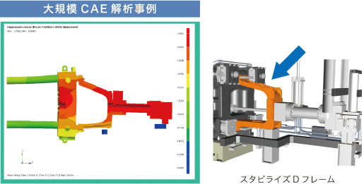- 型締部及び射出部をモデル化した大規模高度CAE解析(ADVC)を実施し、射出装置の挙動を定量的に分析。射出Dフレームを適した形状設計として、チップ?スリーブの長寿命化に貢献。